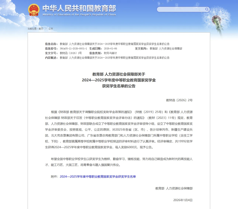 近日,教育部公布2024—2025学年度中等职业教育国家奖学金获奖学生名单。经校级推荐、省级评审和国家级复核,全国共19992名中职学生获此殊荣,我校9名优秀学子成功入选,每人将获得6000元奖励。