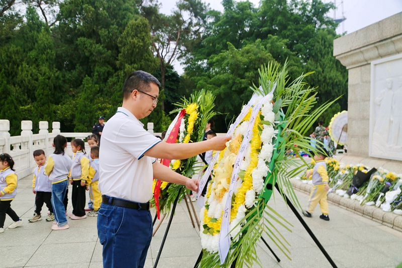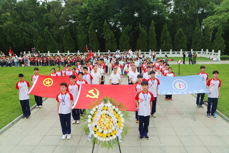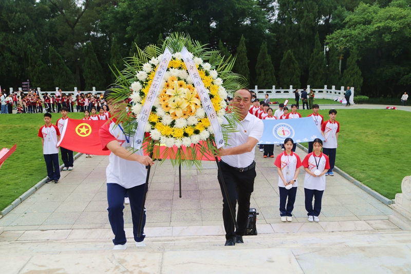 在人民公园里的革命烈士纪念碑前,参加活动的全体师生整齐列队,向革命先烈默哀,致敬不朽功勋。师生代表向革命烈士敬献花圈,陈宇前上前整理挽联。随后,全体人员依次瞻仰纪念碑,并敬献小白花寄托哀思。