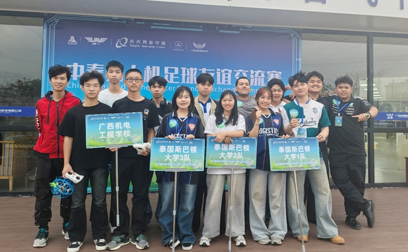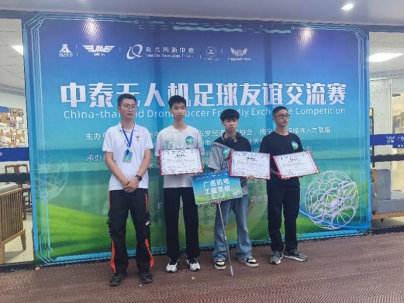 2026年3月25日,应南宁市低空经济产业协会与泰国低空经济协会邀请,学校无人机代表队一行5人,由张文卿老师带队,赴南宁市仙葫大道广西桂翼智能无人机飞行训练基地参加首届中泰无人机足球友谊交流赛。该赛事是“中泰低空经济应用场景对接会(第三期)”的重要组成部分,由青秀创新中心、泰国低空经济协会等单位联合主办,旨在搭建中泰青年无人机技术交流平台。赛场上,学校队员与泰国斯巴顿大学选手同台竞技,凭借稳定发挥与默契配合,荣获赛事“未来之星”奖项。