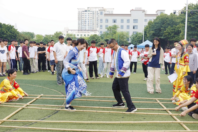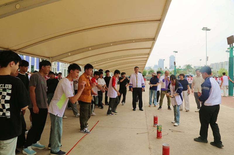 本次现场活动围绕"玩""做""吃"三大板块展开。在民族体育竞技区,投壶、高杆绣球、跳竹竿、勾腿火车、挑扁担运零食等项目吸引了大量师生踊跃参与。大家在竞技中体验壮族传统体育的独特魅力,现场加油声、欢呼声此起彼伏,气氛热烈。